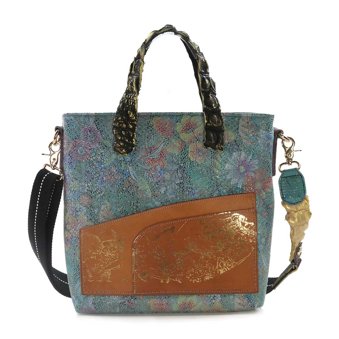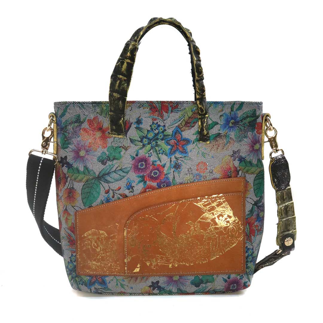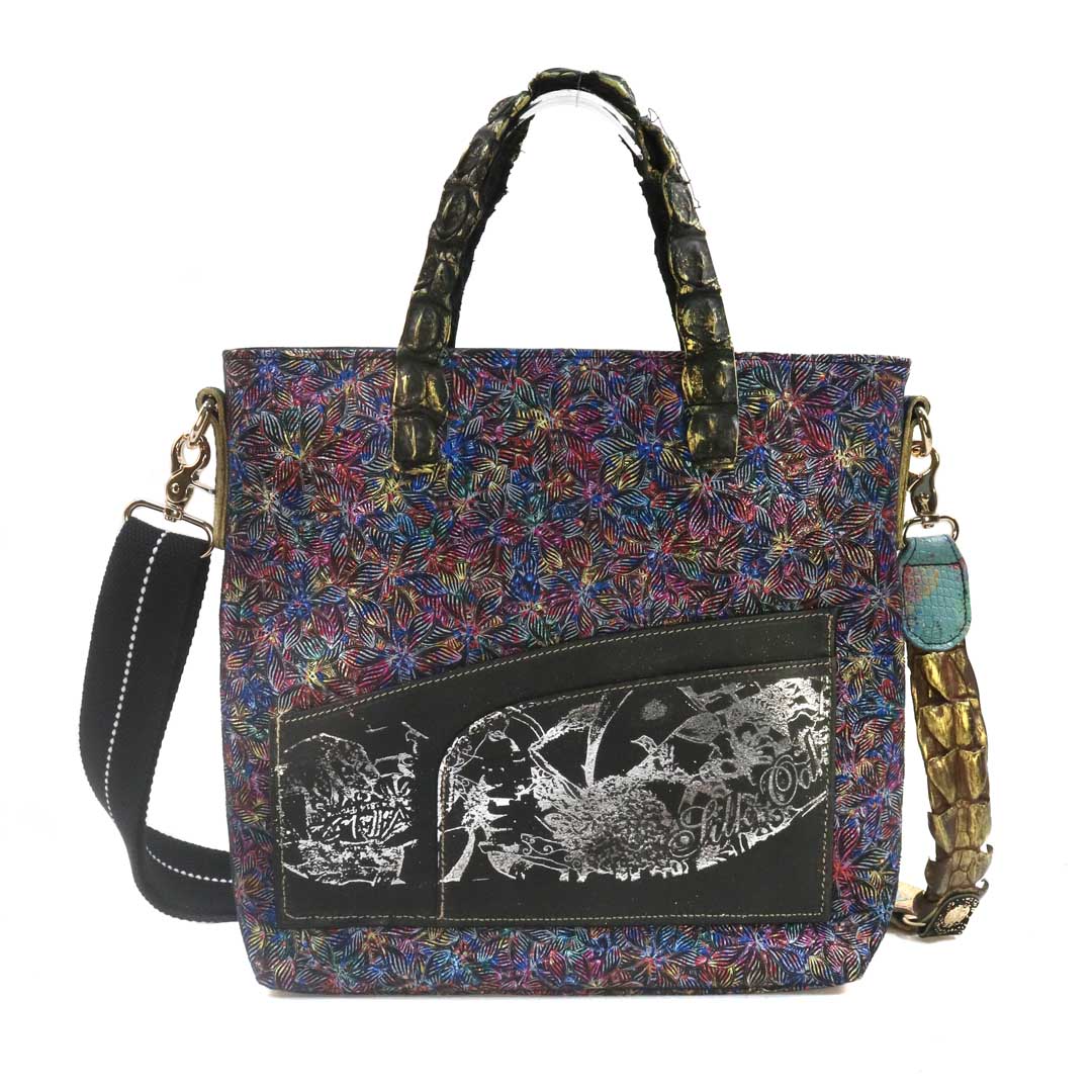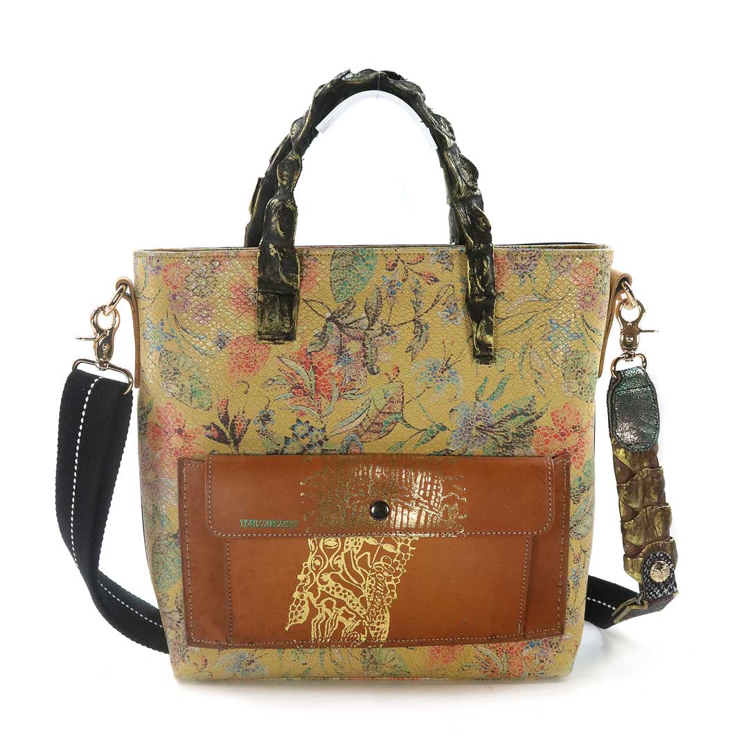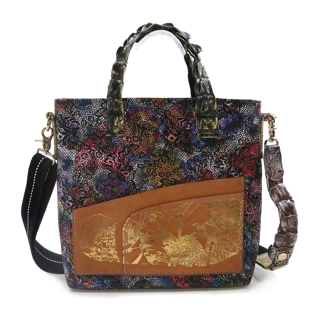商品簡介:伊艾拉 黃牛花毯皮+鴨巴甸+鱷魚脊提把+鱷魚脊帶織背織