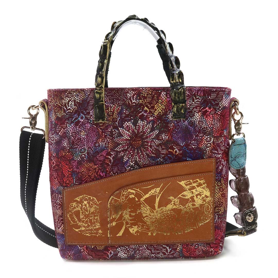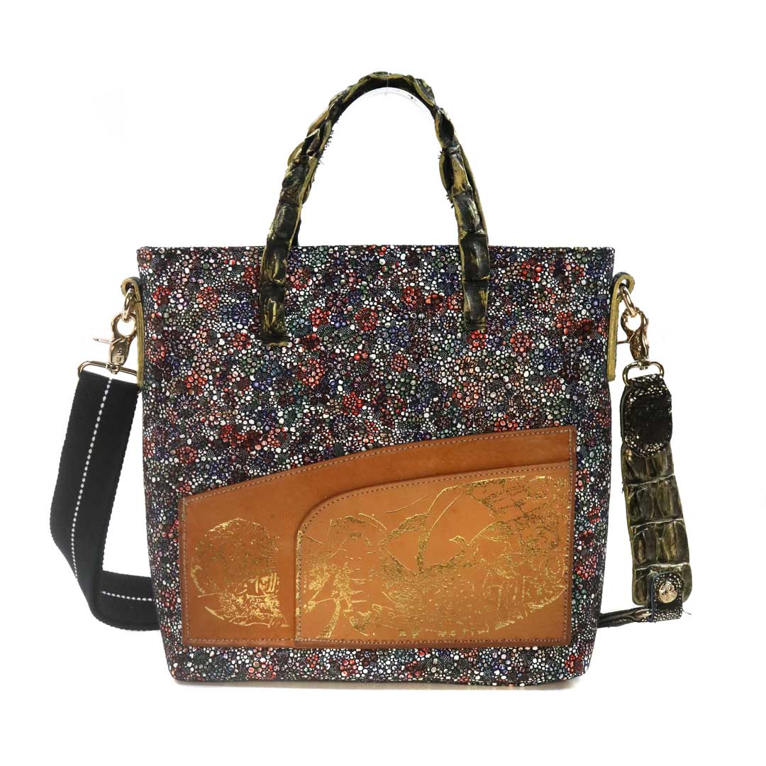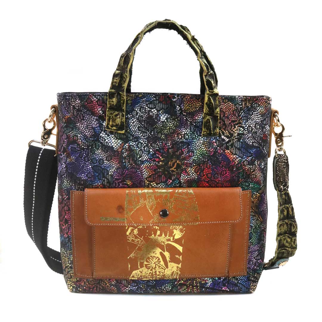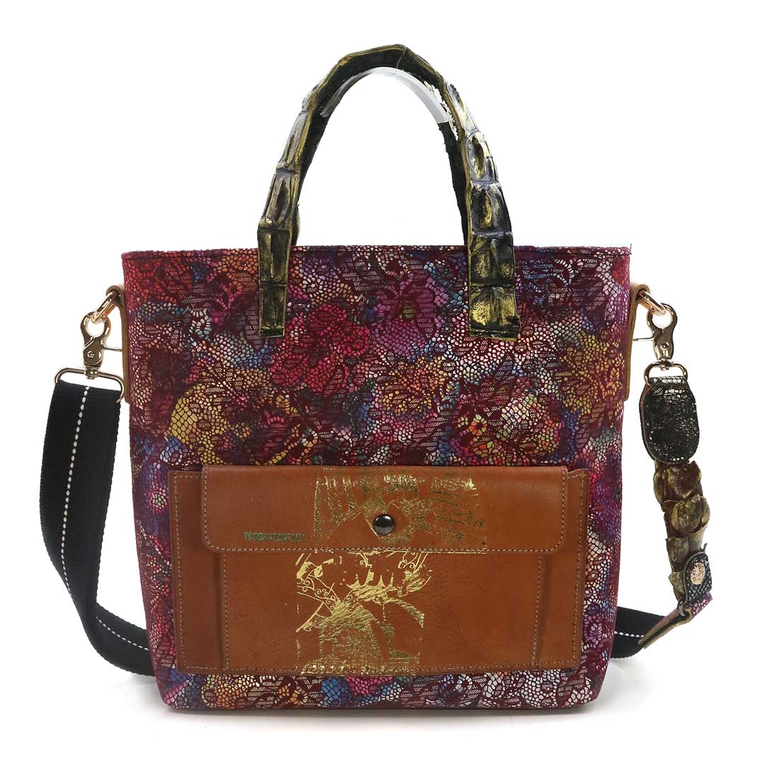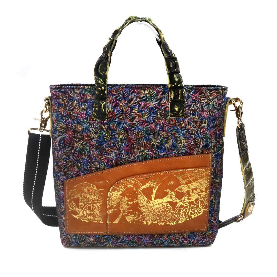 商品簡介:伊艾拉 黃牛花毯皮+鴨巴甸+鱷魚脊提把+鱷魚脊帶織背織