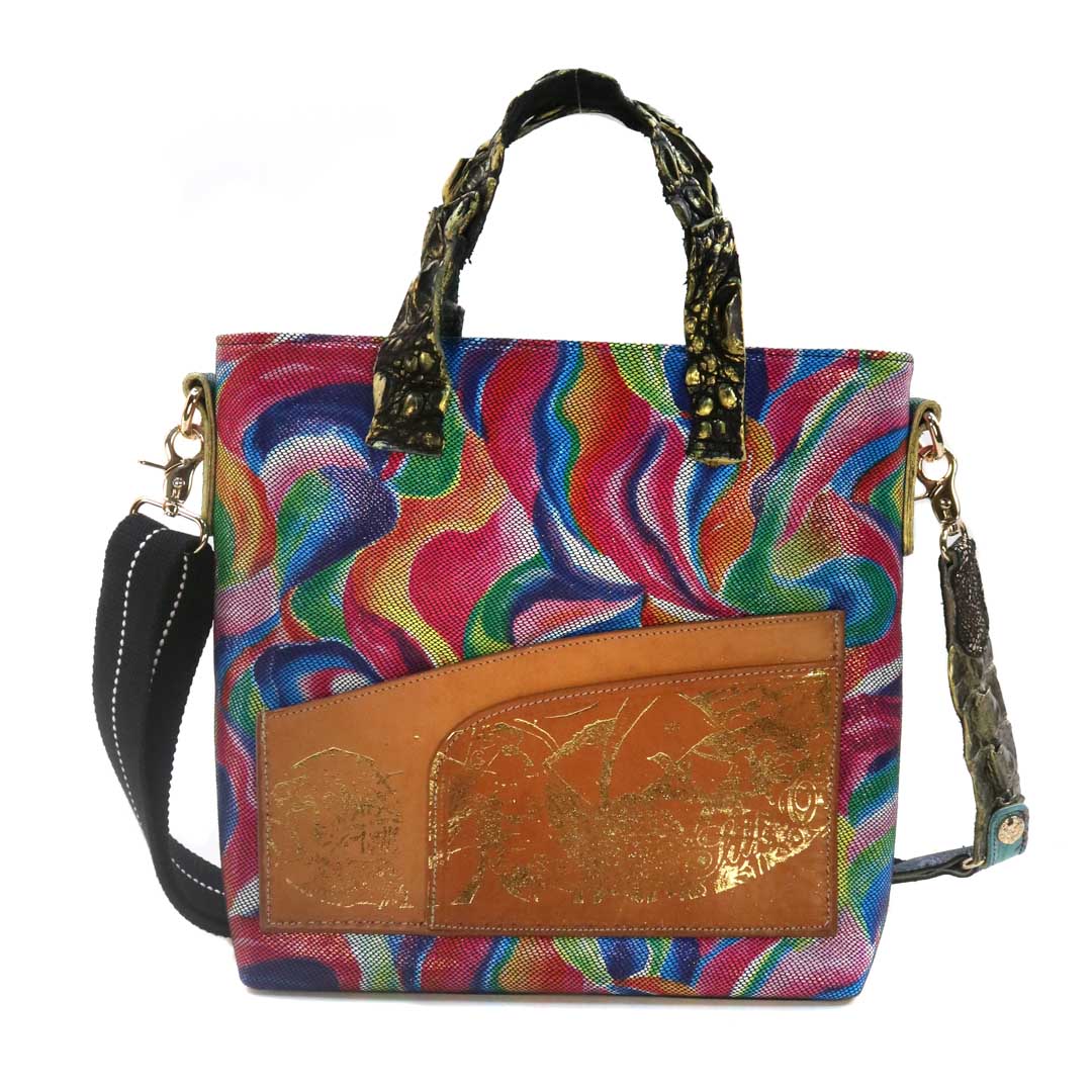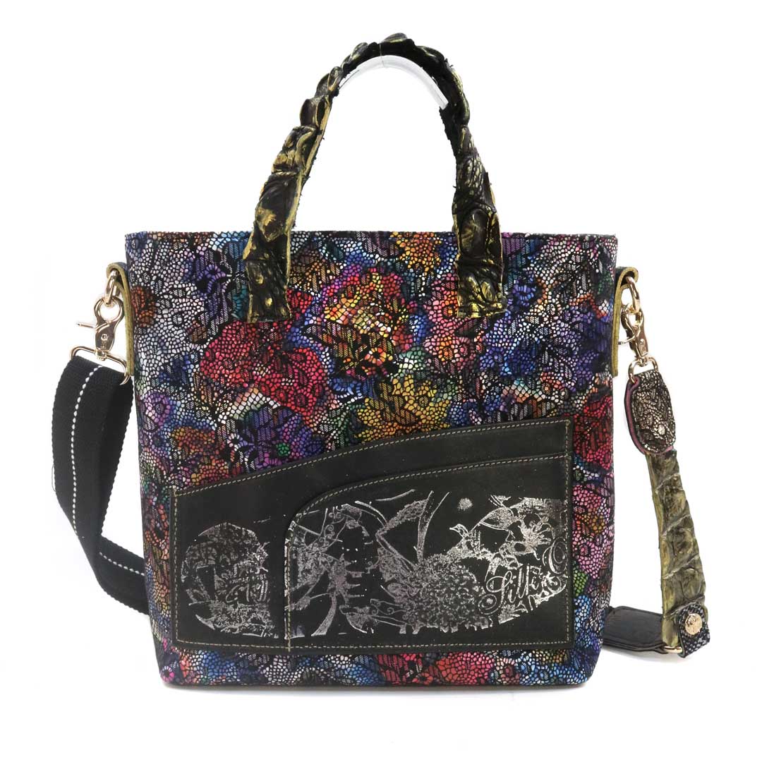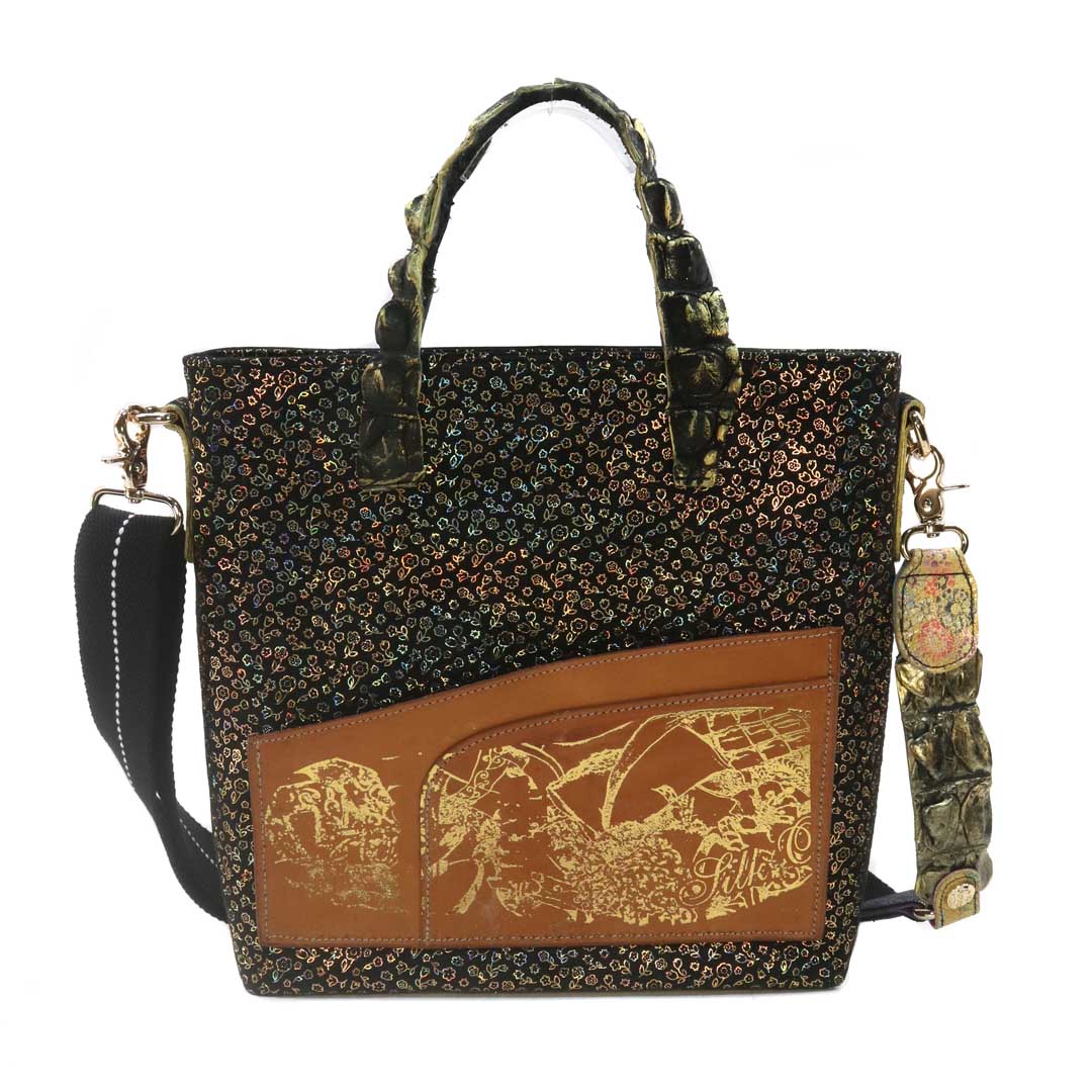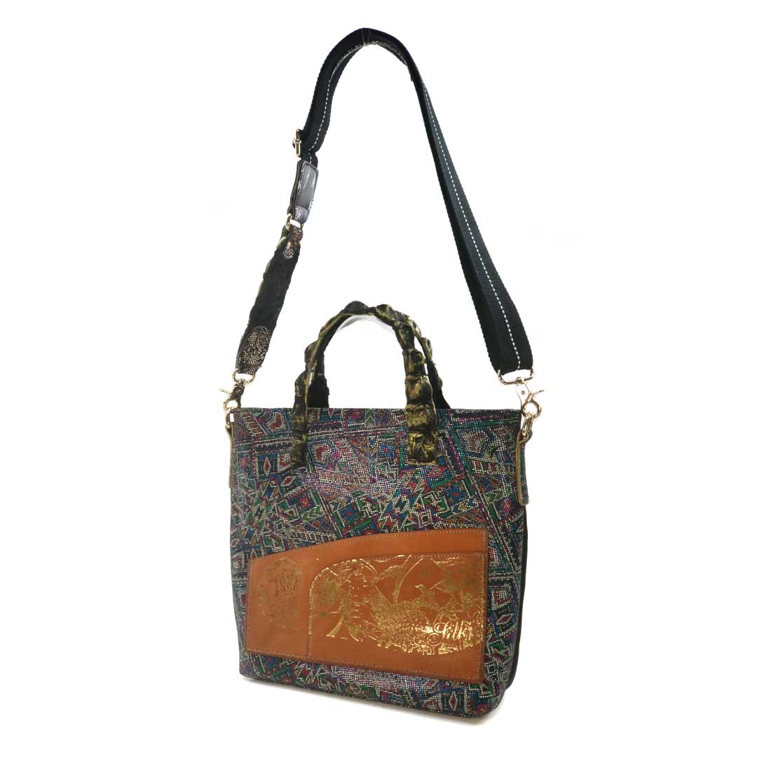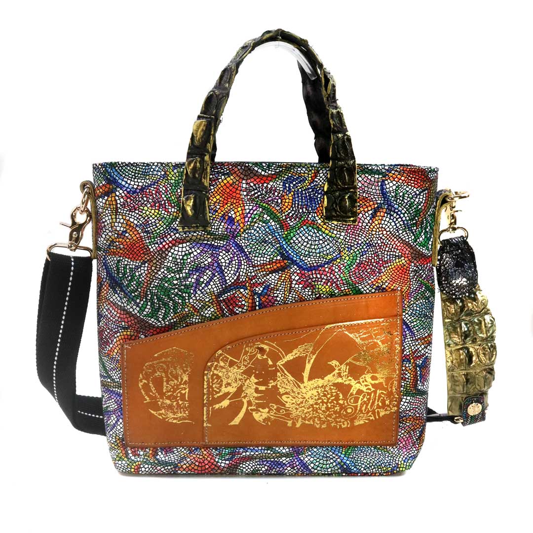商品簡介:伊艾拉 黃牛花毯皮+鴨巴甸+鱷魚脊提把+鱷魚脊帶織背織