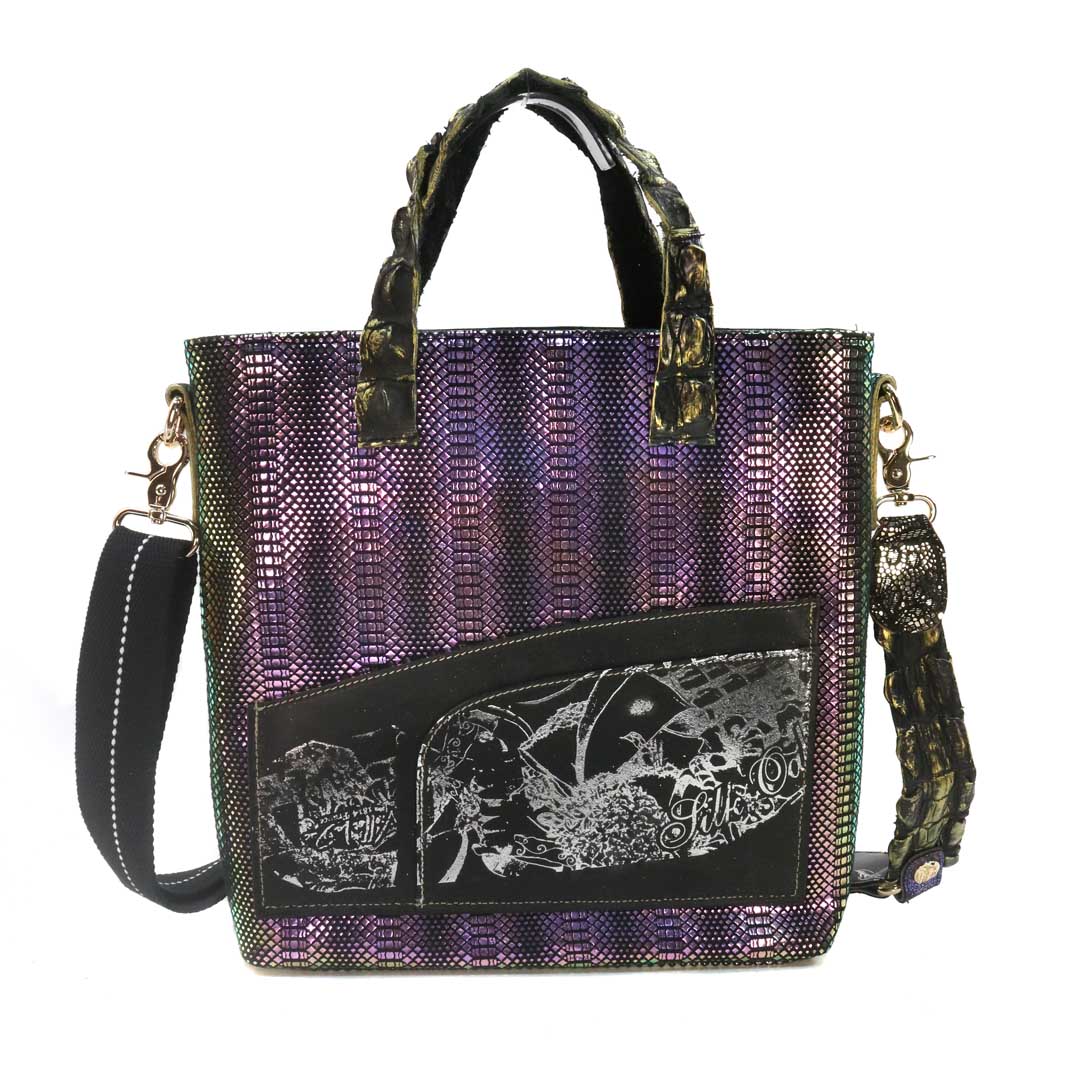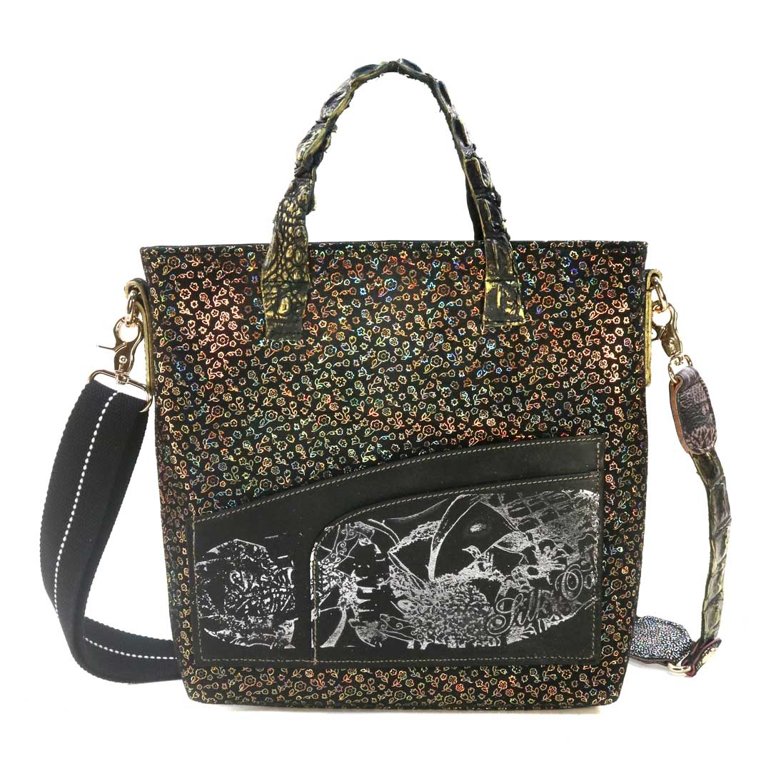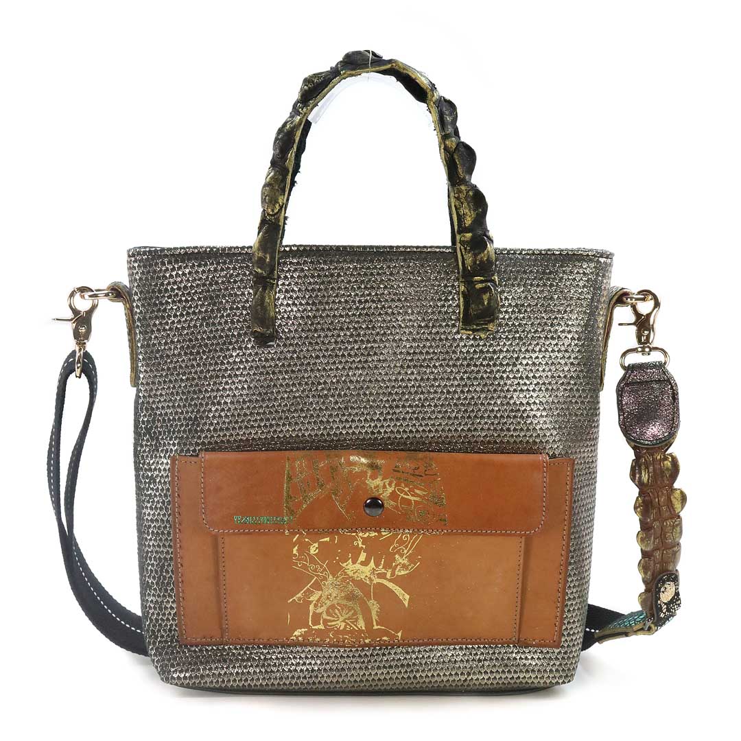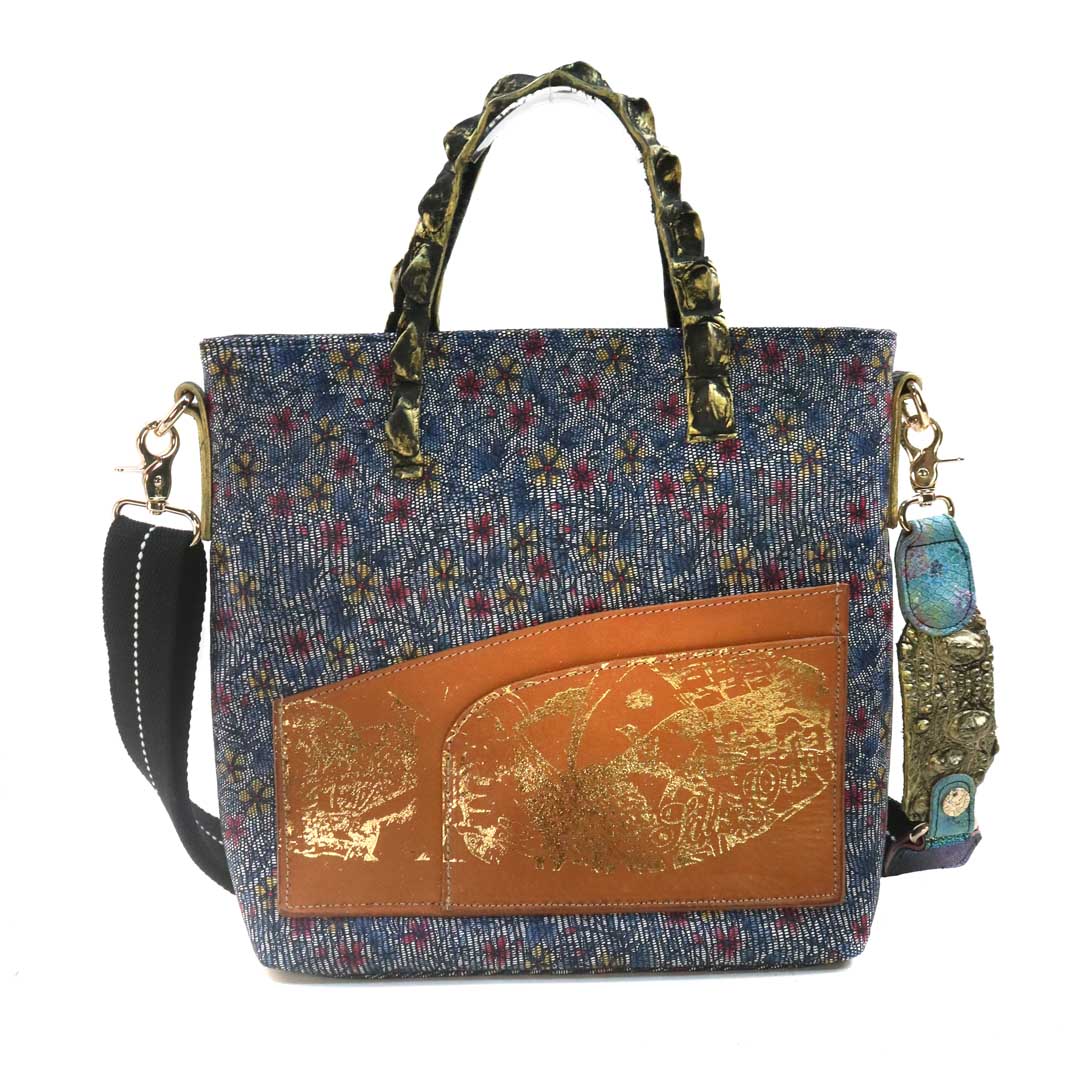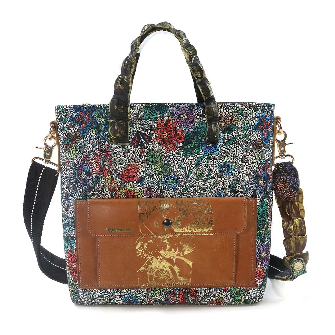 商品簡介:伊艾拉 黃牛花毯皮+鴨巴甸+鱷魚脊提把+鱷魚脊帶織背織