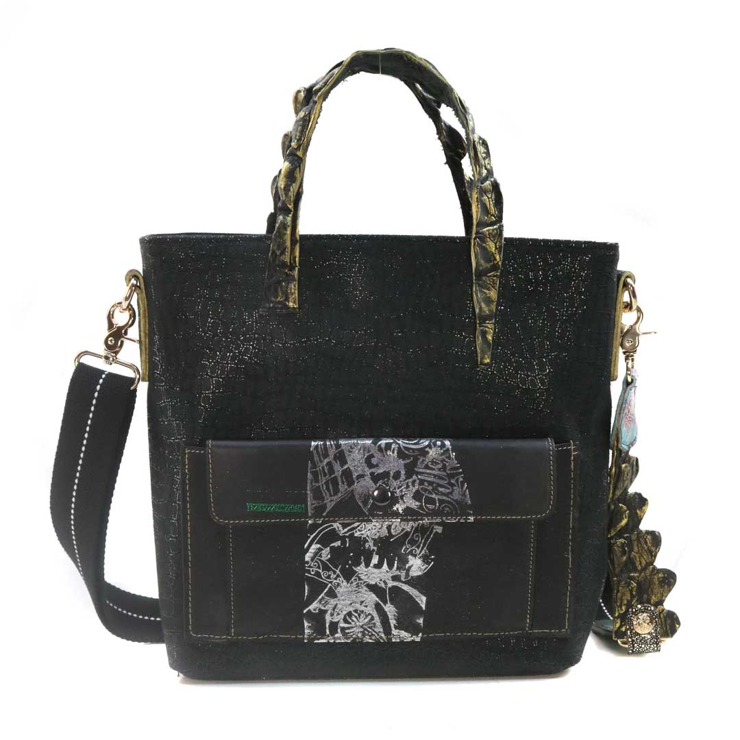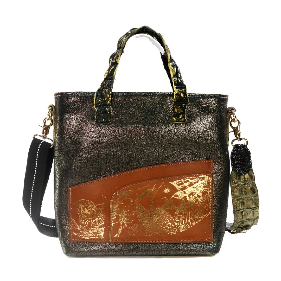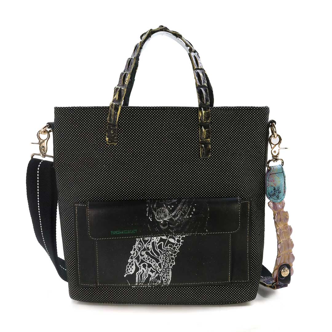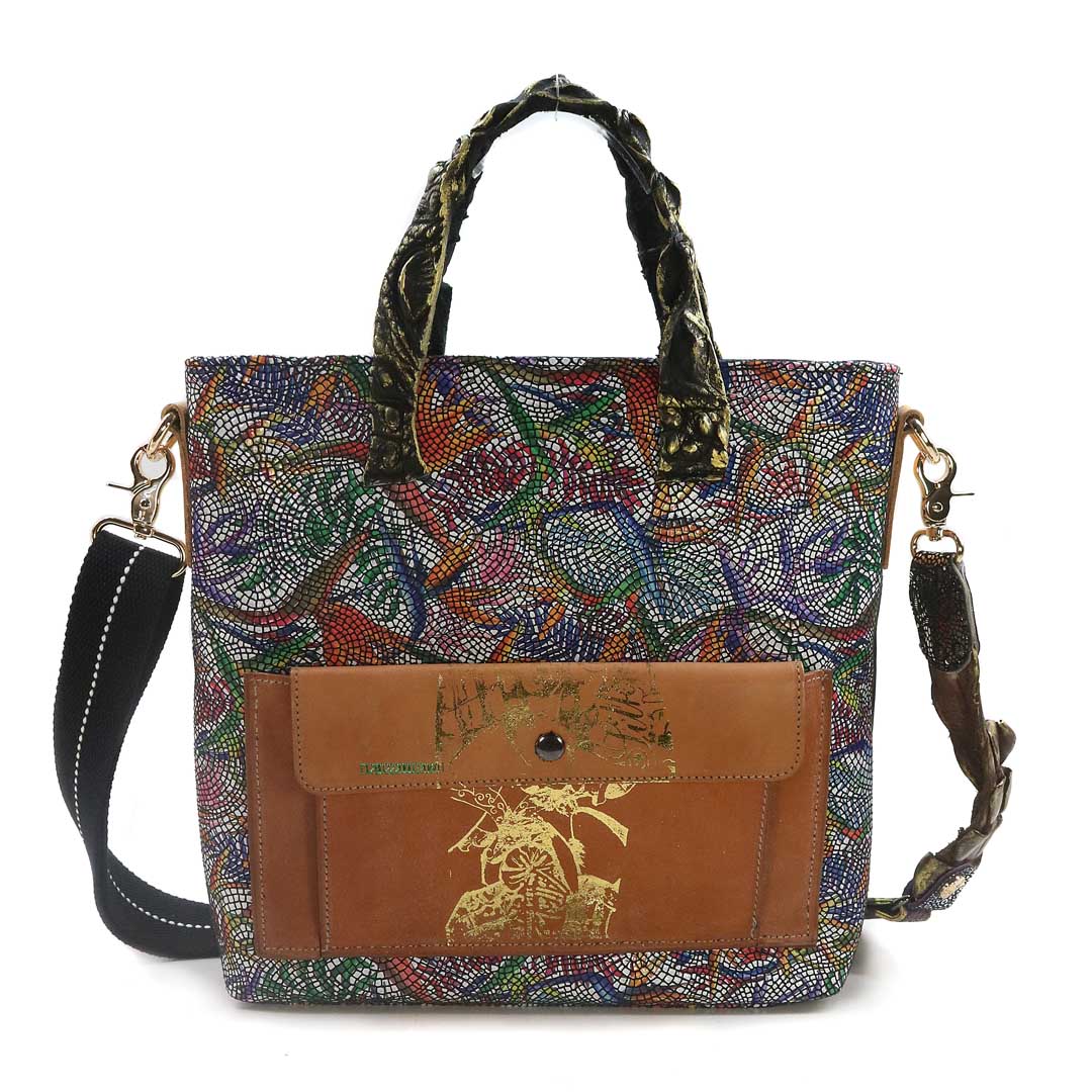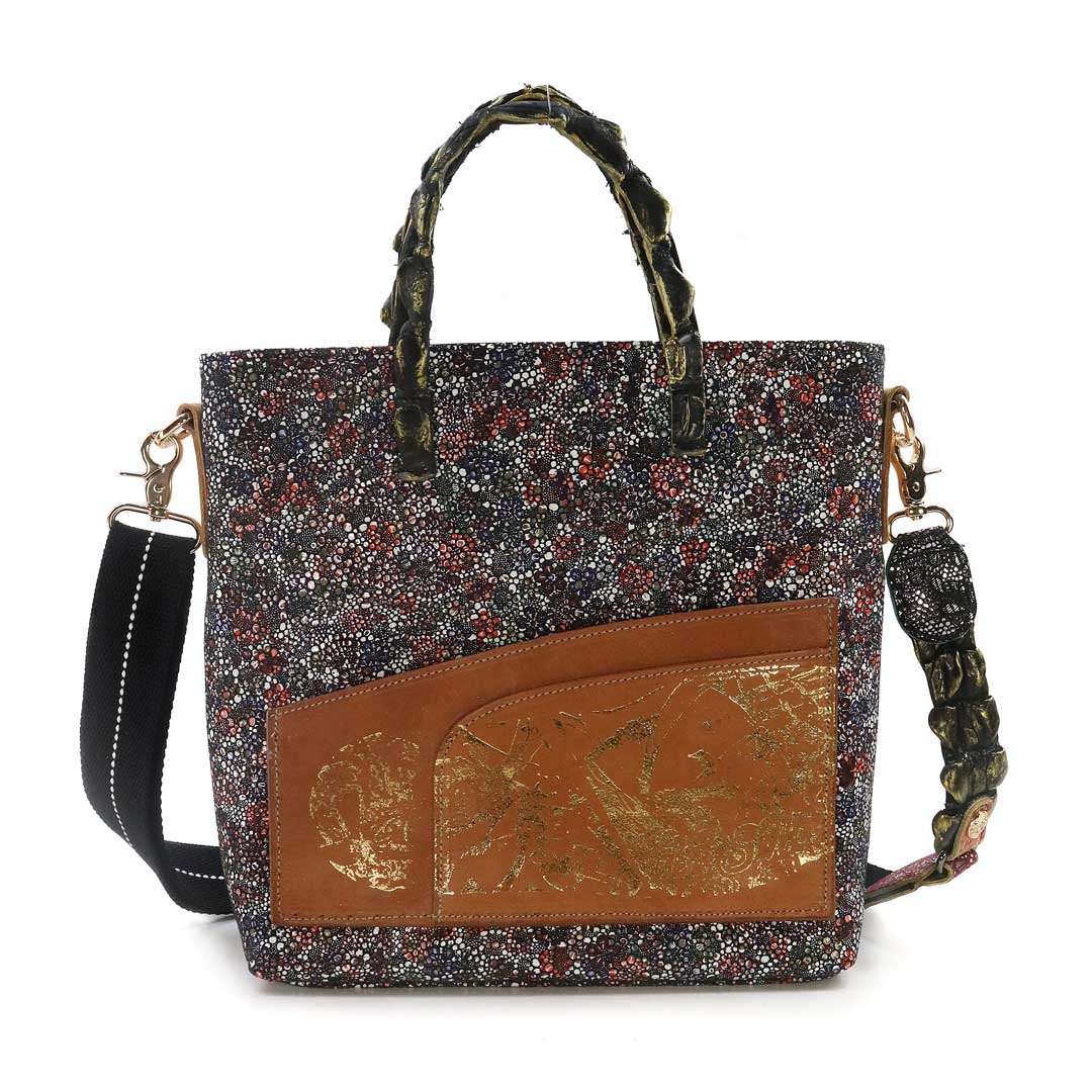 商品簡介:伊艾拉 黃牛花毯皮+鴨巴甸+鱷魚脊提把+鱷魚脊帶織背織