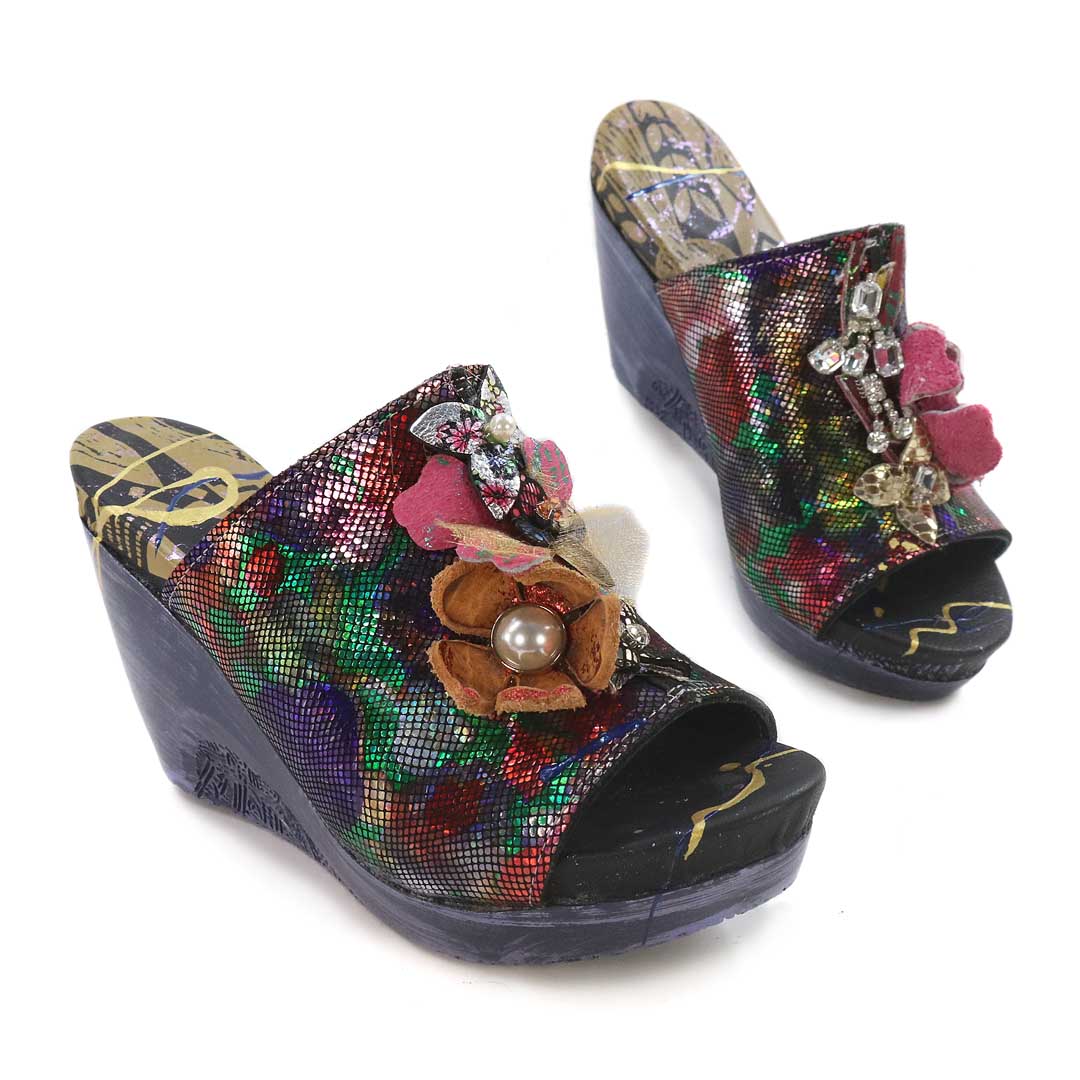 商品簡介:*托勒密 帕諾佩斯 赫柏特索內花毯 *致敬波洛克滴彩畫 *天然植物丹寧苯染,黃牛皮 *黃牛皮鞋墊內裡 *PU楔型跟氣墊底 *鉗幫鞋 *奧地利水晶彩鑽、七大國皮草皮花