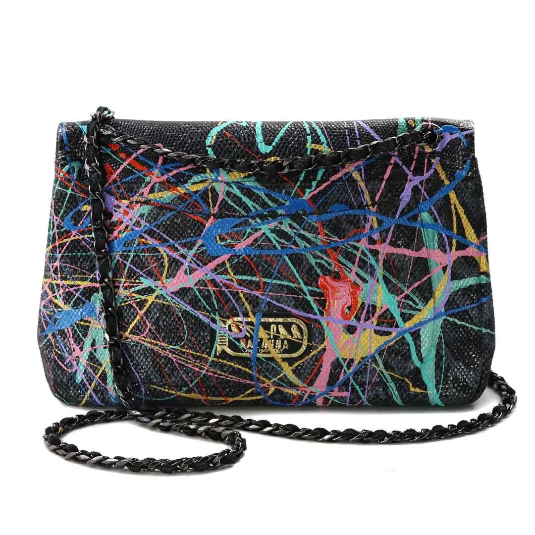 商品簡介:肯亞岩蟒皮 ,山羊皮,波洛克 美國抽象表現主義,1912-1956首創,滴畫法,以滴彩畫為基底,上著犛牛皮飛雲流竄!波洛克1912-1956醇酸磁漆(彩瓷漆)觀畫時腦中的「鏡像神經元」被觸動,波洛克:被動的接受畫提供的意向,不要帶主觀意識去尋找主題。波作劃時沈緬於嚇人的狂熱行為