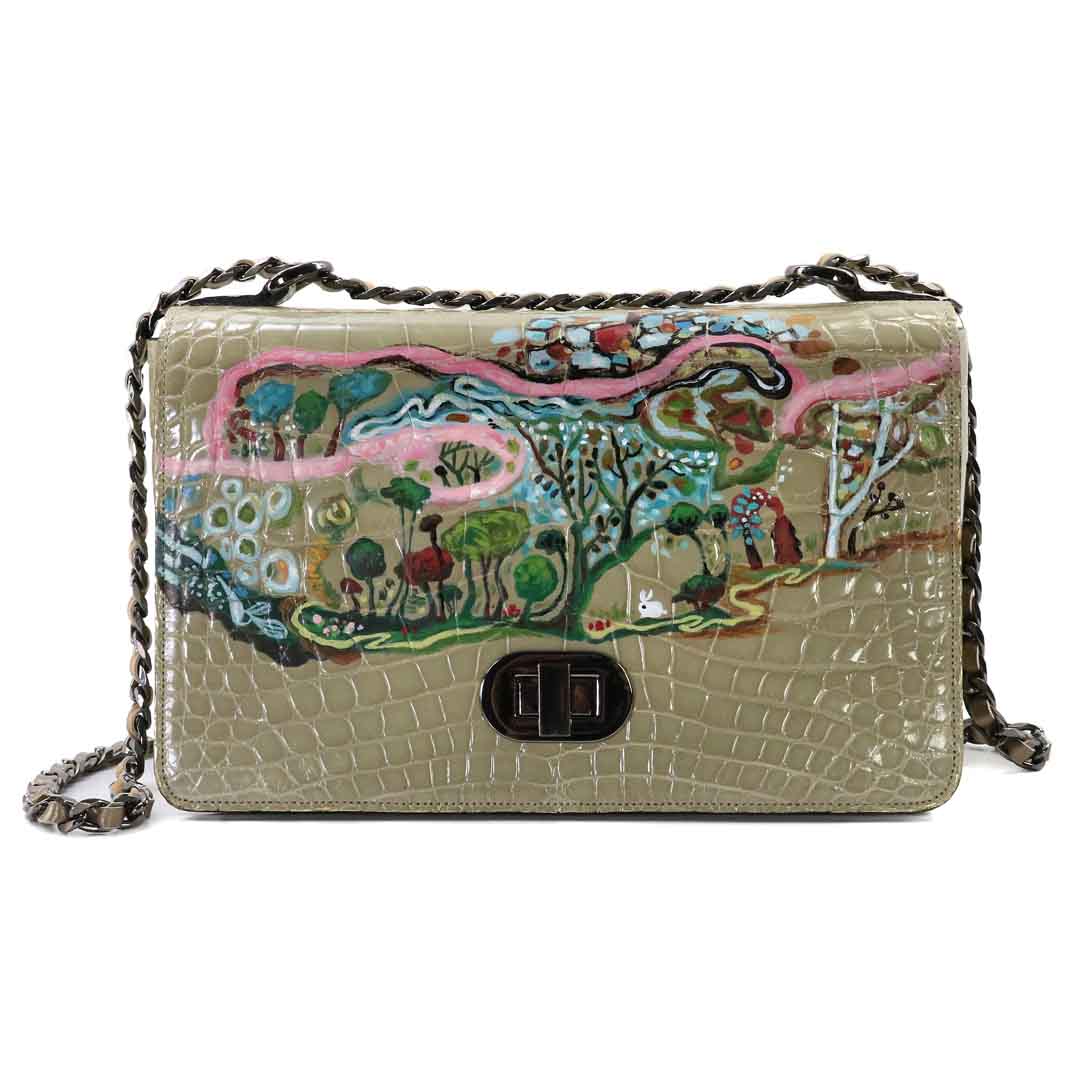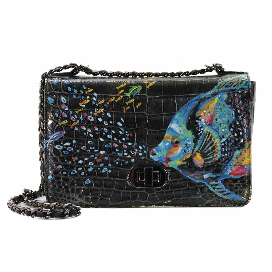 商品簡介:埃及尼羅河三角洲鹹水野生鱷魚脊,肯亞岩蟒皮,黃牛皮,波洛克 美國抽象表現主義,1912-1956首創,滴畫法,以滴彩畫為基底,上著犛牛皮飛雲流竄!波洛克1912-1956醇酸磁漆(彩瓷漆)觀畫時腦中的「鏡像神經元」被觸動,波洛克:被動的接受畫提供的意向,不要帶主觀意識去尋找主題。波作劃時沈緬於嚇人的狂熱行為