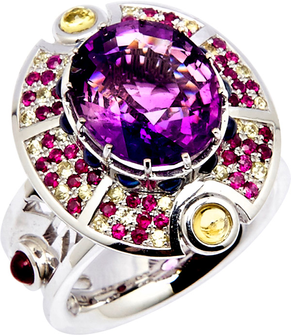 商品簡介:4.62ct 紫色水晶 白K金台鑲彩色藍寶鑲鑽 ,價格店洽